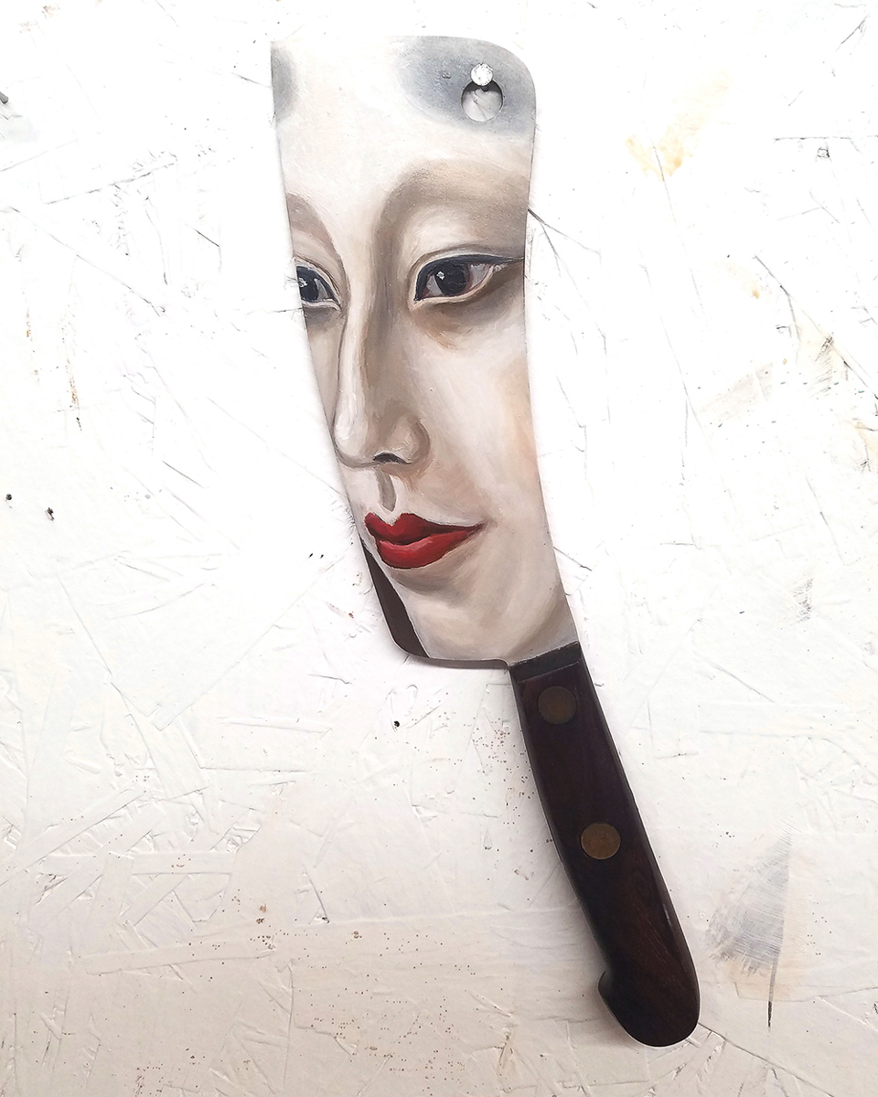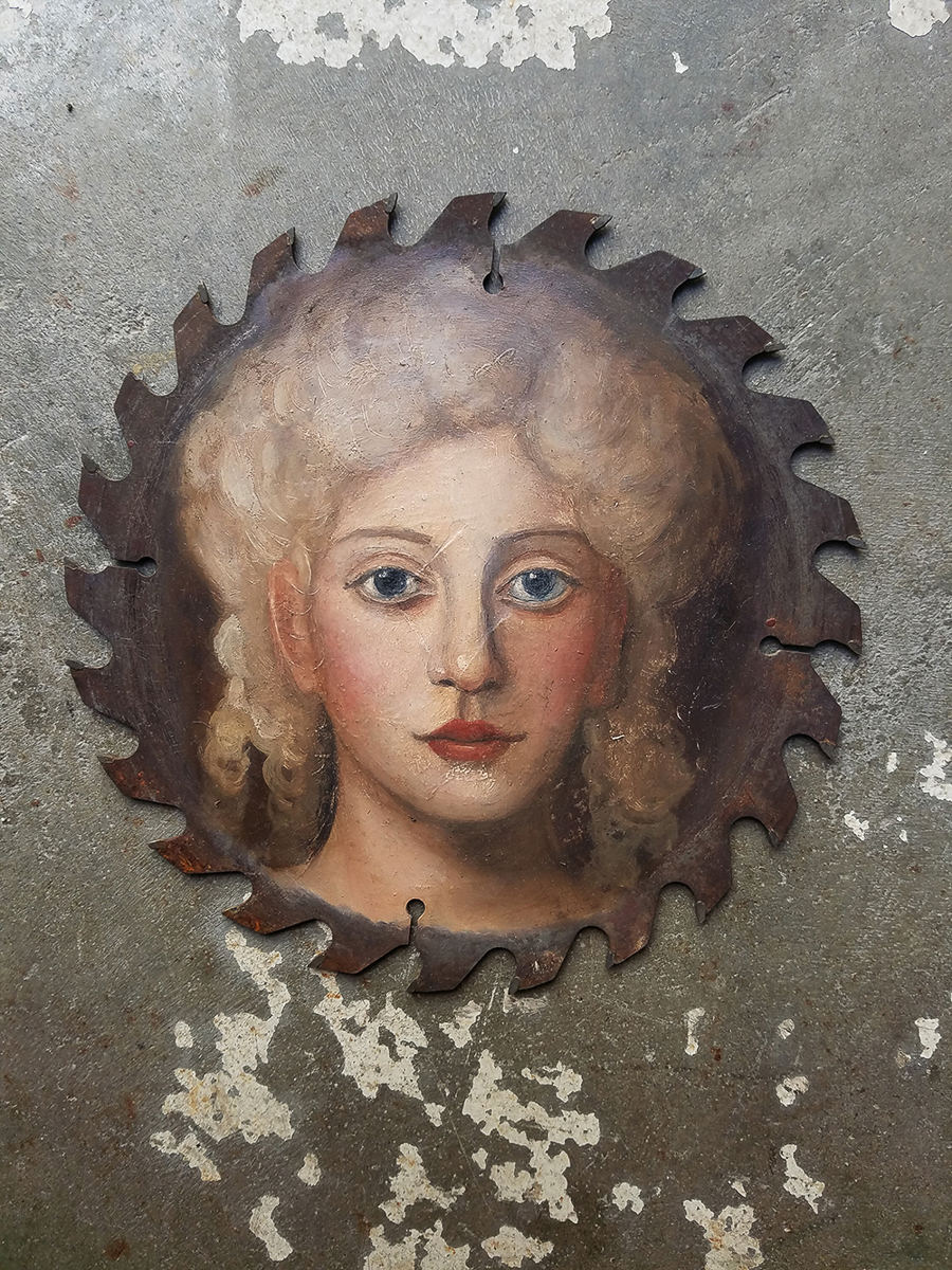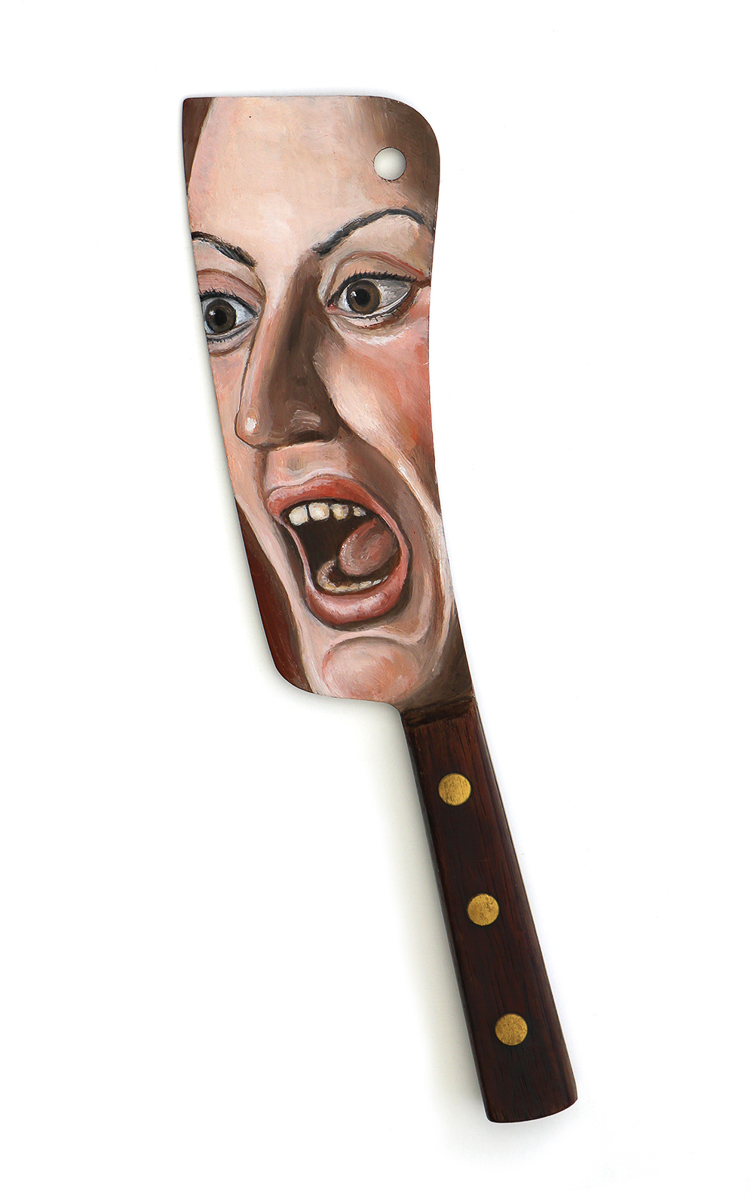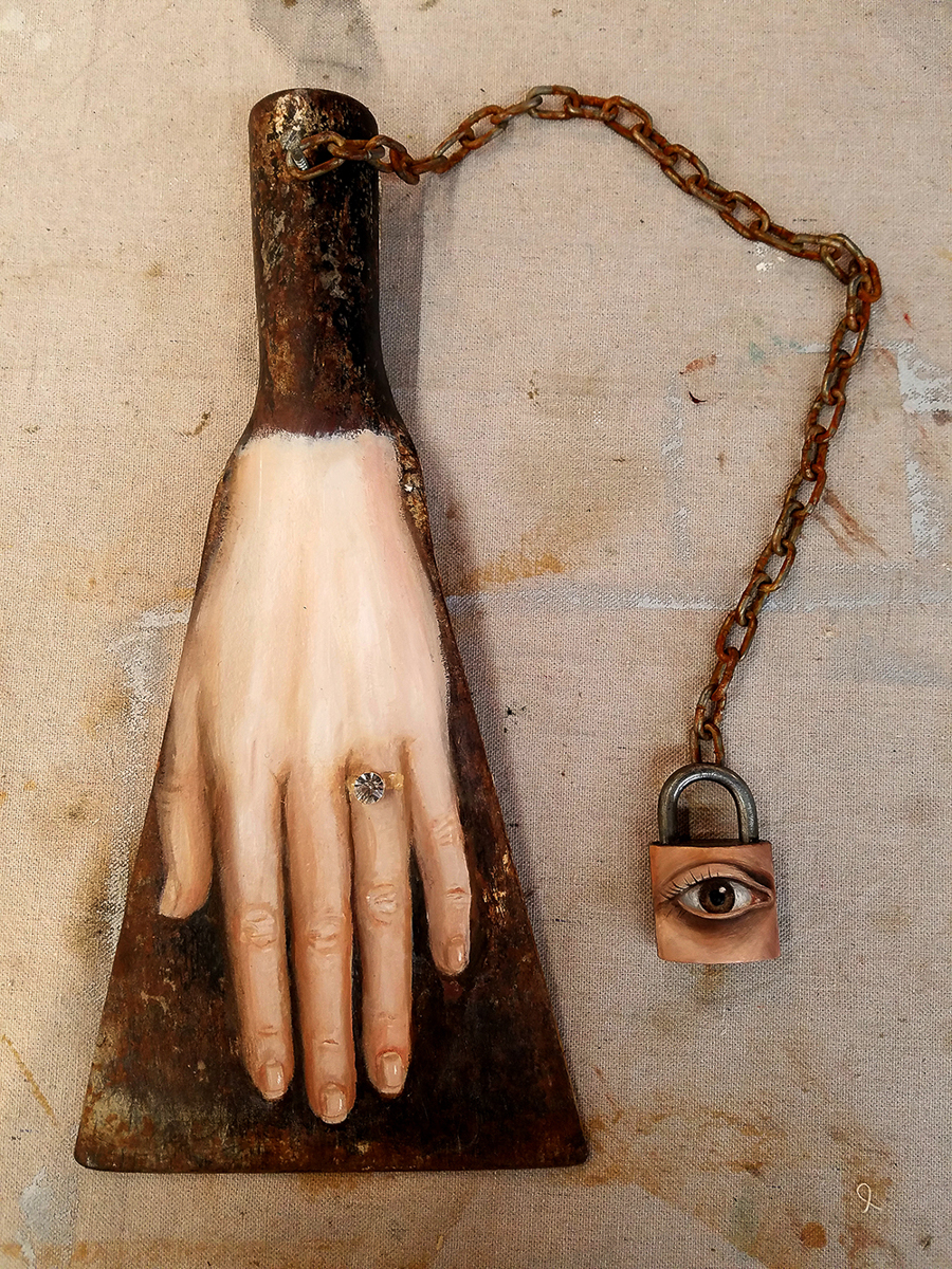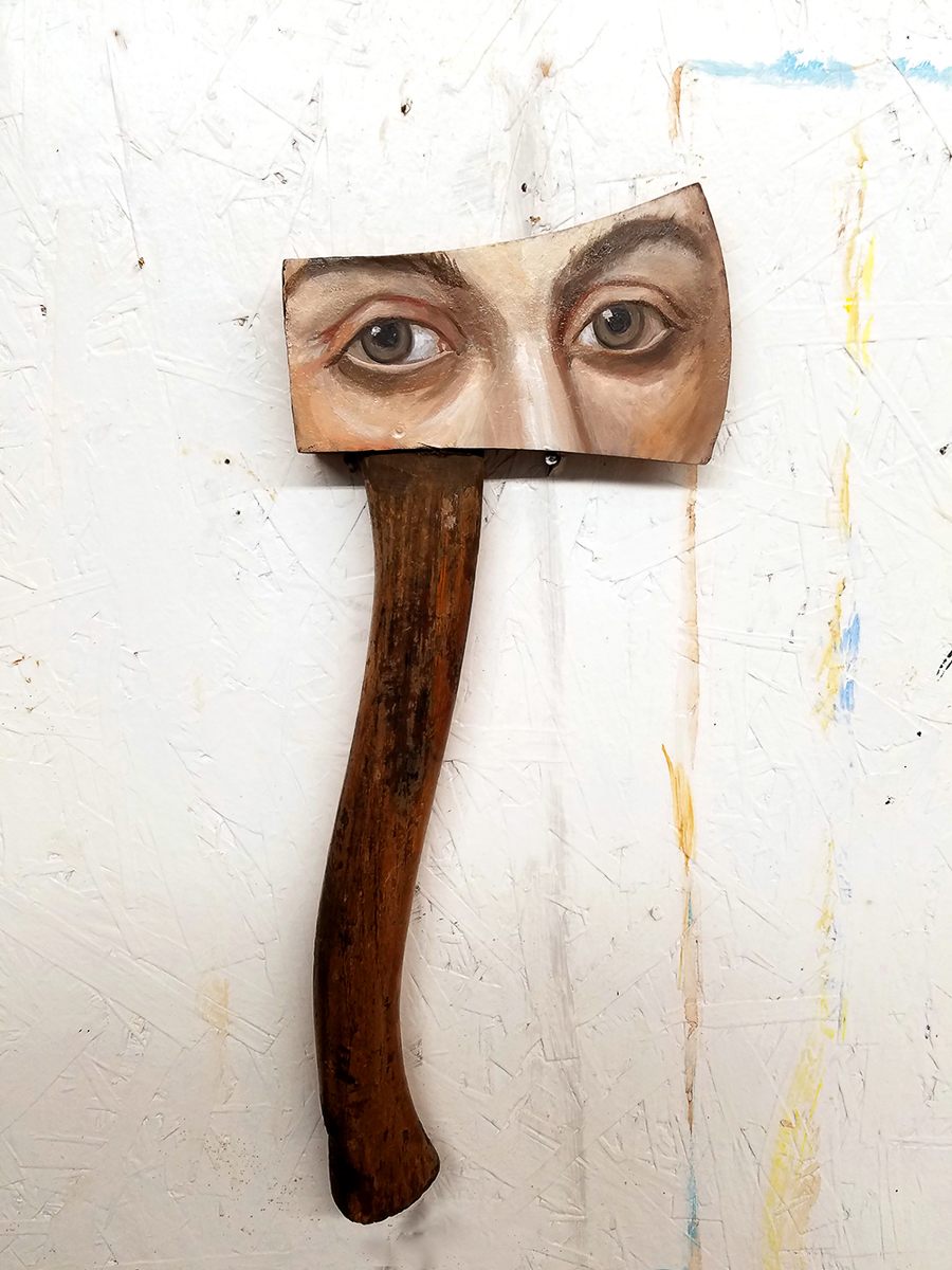 Her work on other found objects, such as axes, cleavers and locks, is more provocative. “The portraits on tools are complex.” she says. “They’re about inner motivations, personal relationships and powerful emotions. They are intended to make you think.”