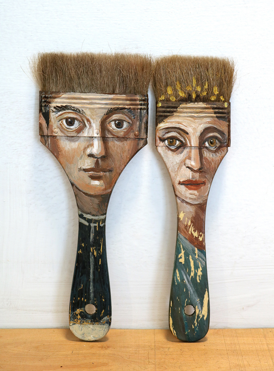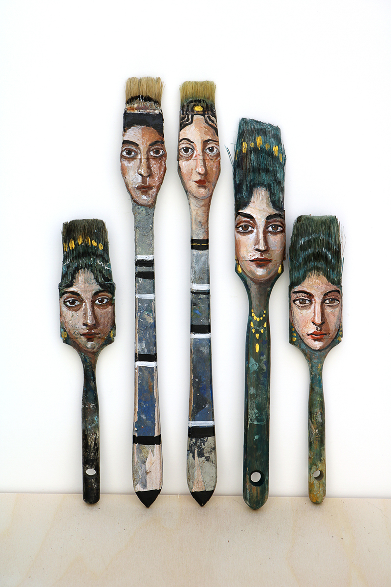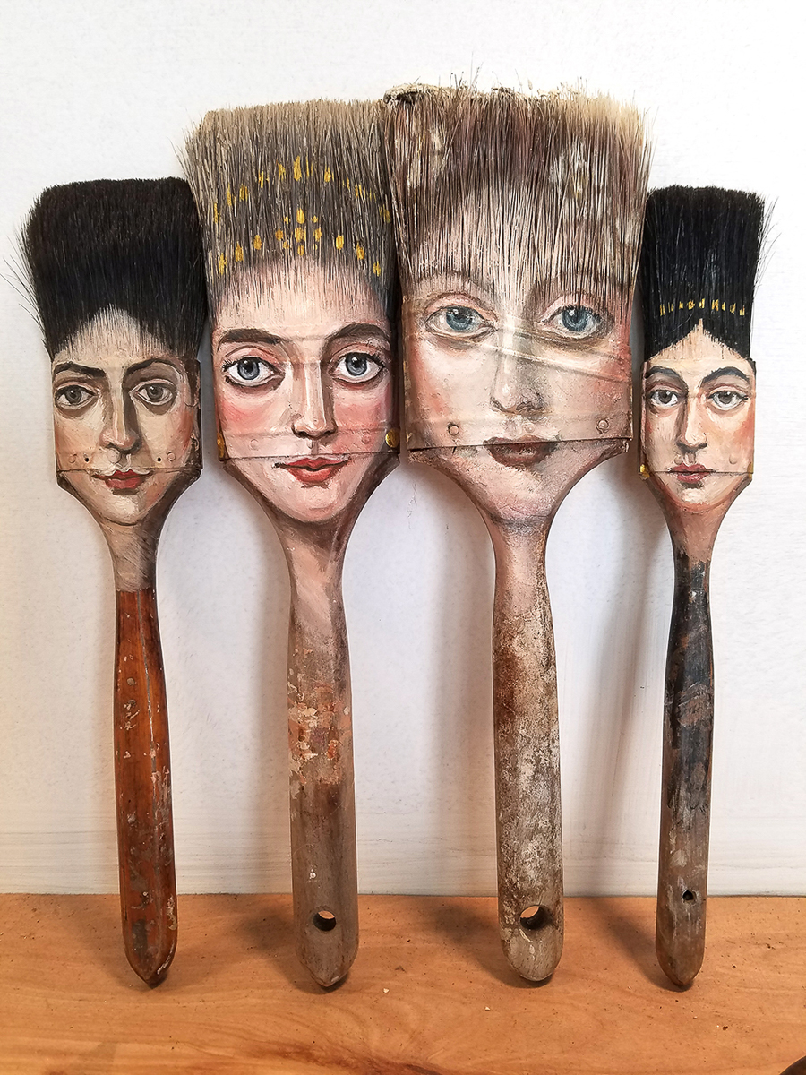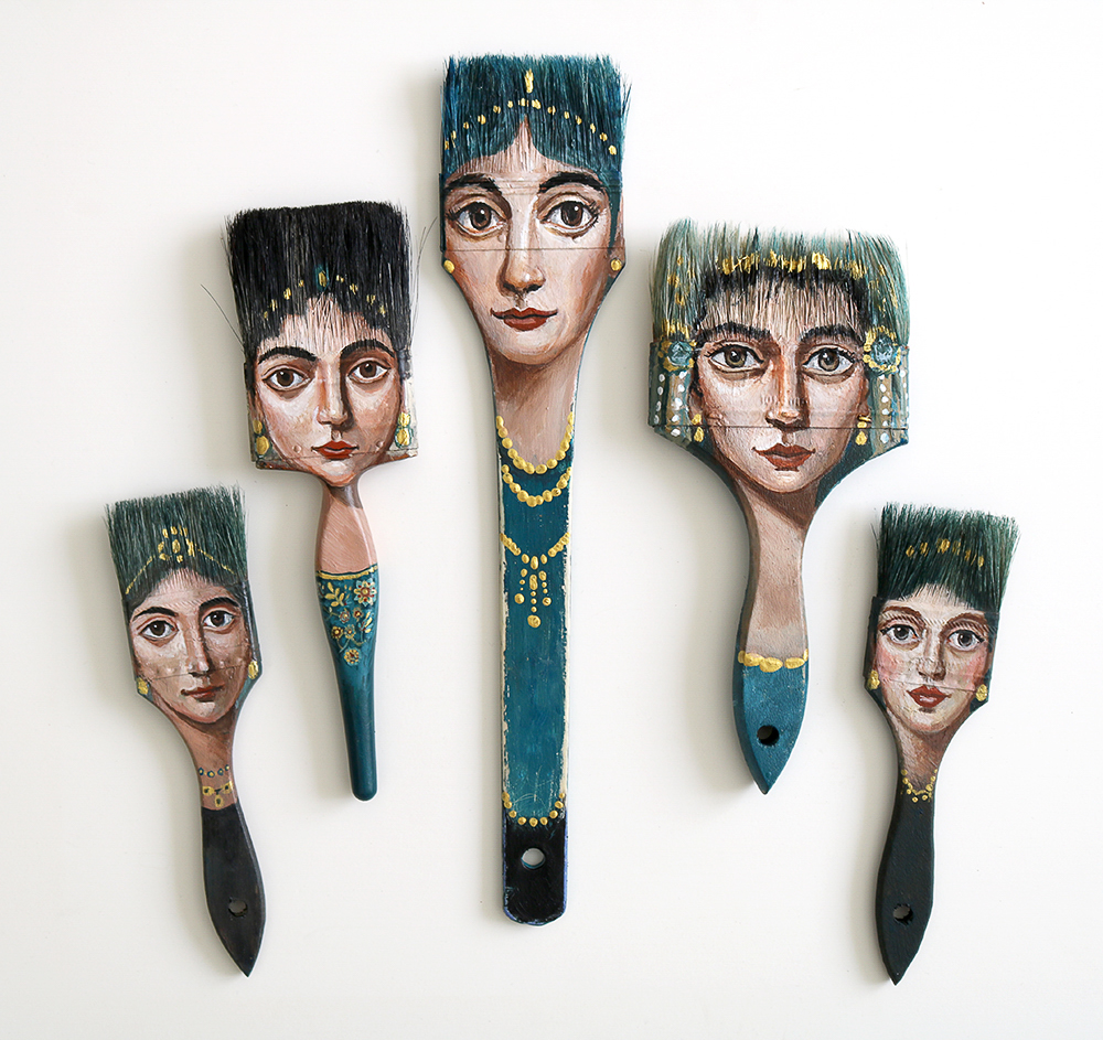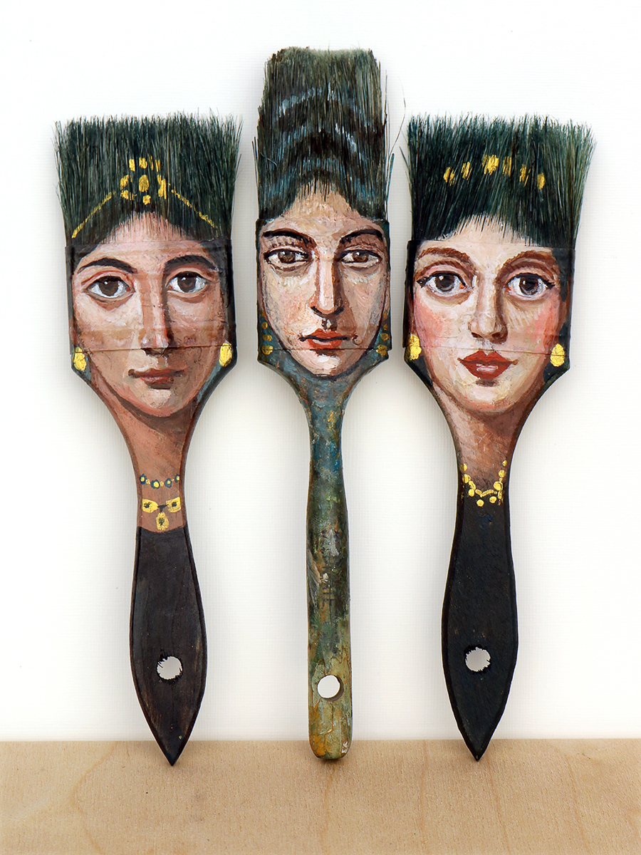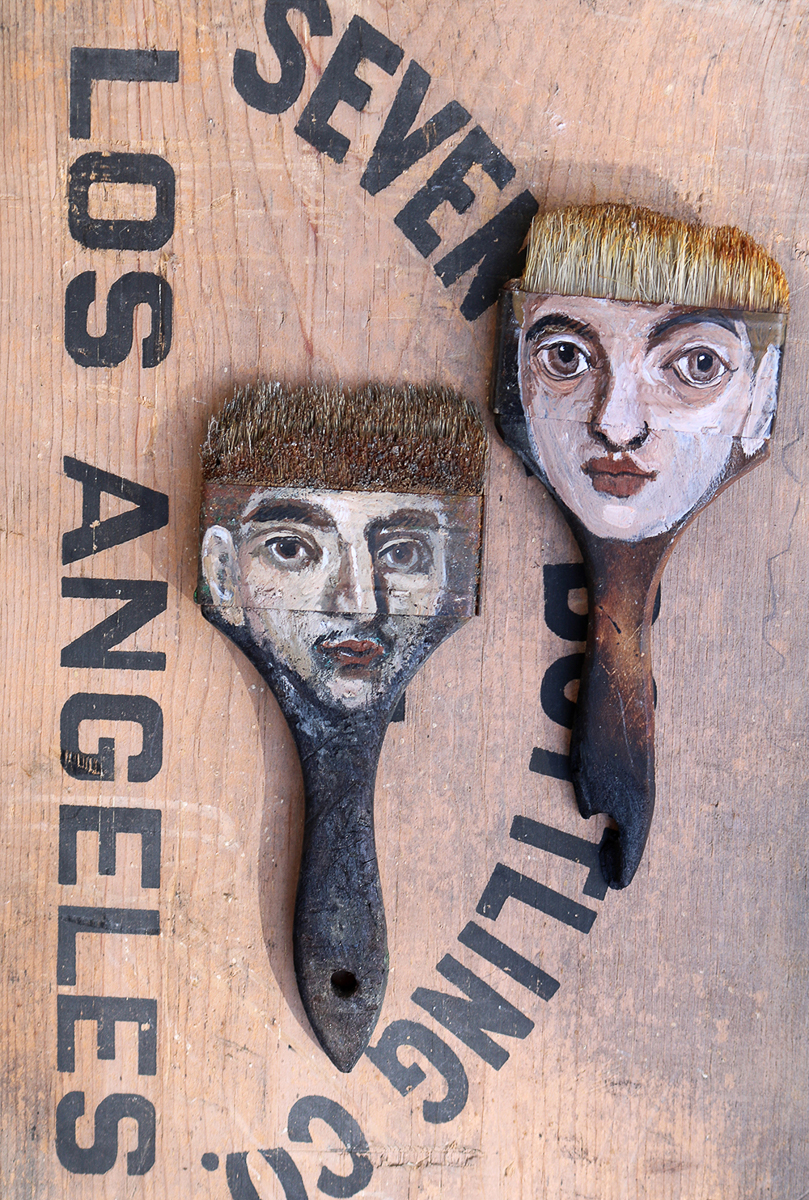 Artist Alexandra Dillon is a Los Angeles-based surrealist who paints on found objects. Her charming portraits on worn paintbrushes have become her signature pieces. Rather than start with a fixed idea for her imaginary people, she just begins to paint. “They just show up and tell me who they are” she says. Working on each piece over the course of several days, she finds the emotion and personality of her characters. The results are beautiful and engaging faces, often reminiscent of Roman-Egyptian mummy portraits or Baroque painting. “I’m influenced by the art of every era”, she says.
