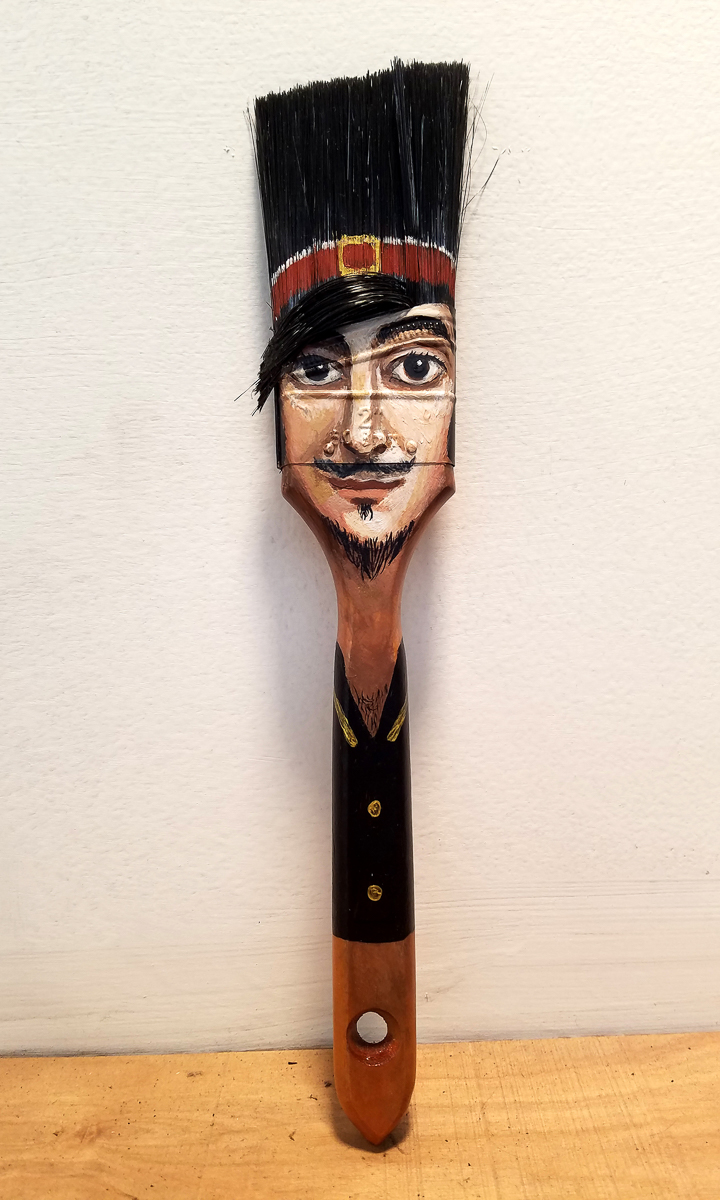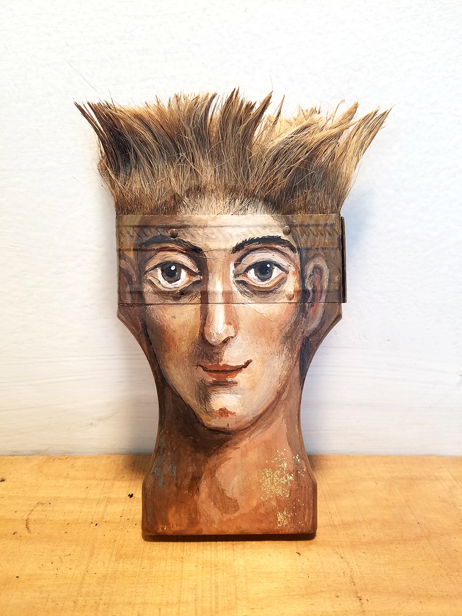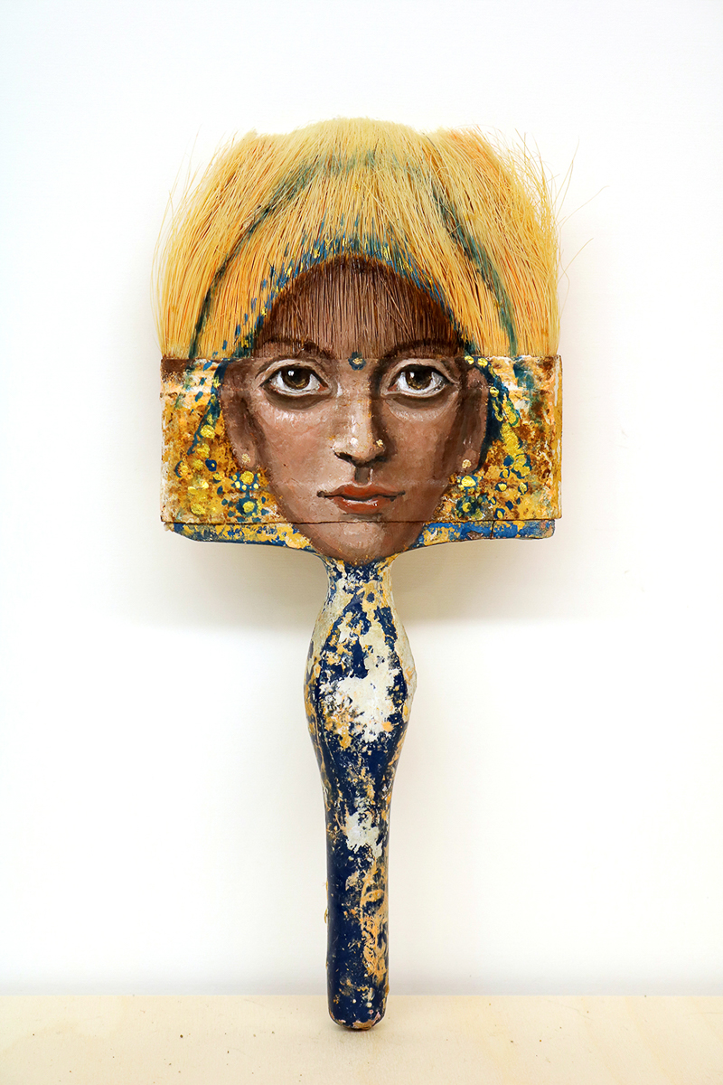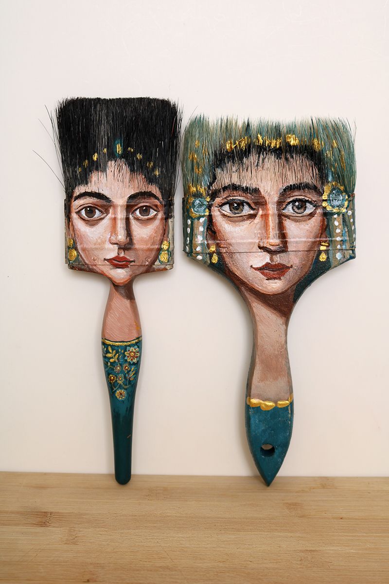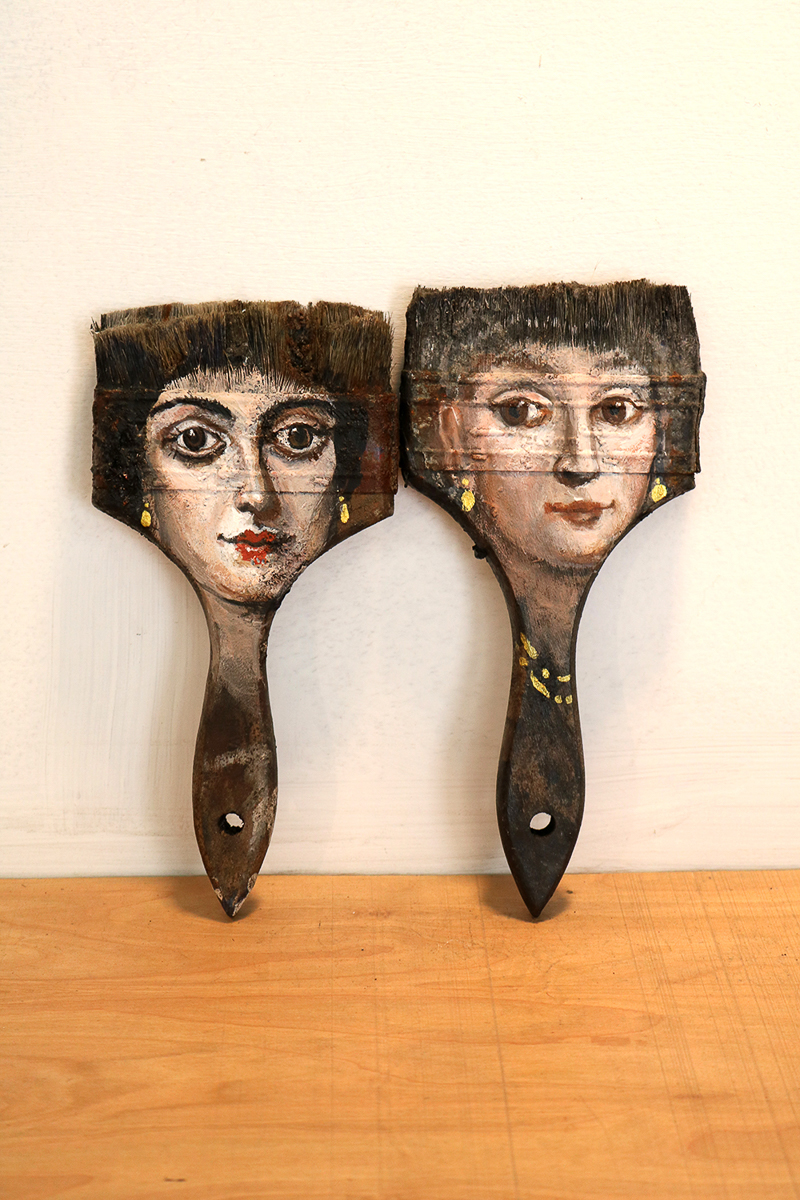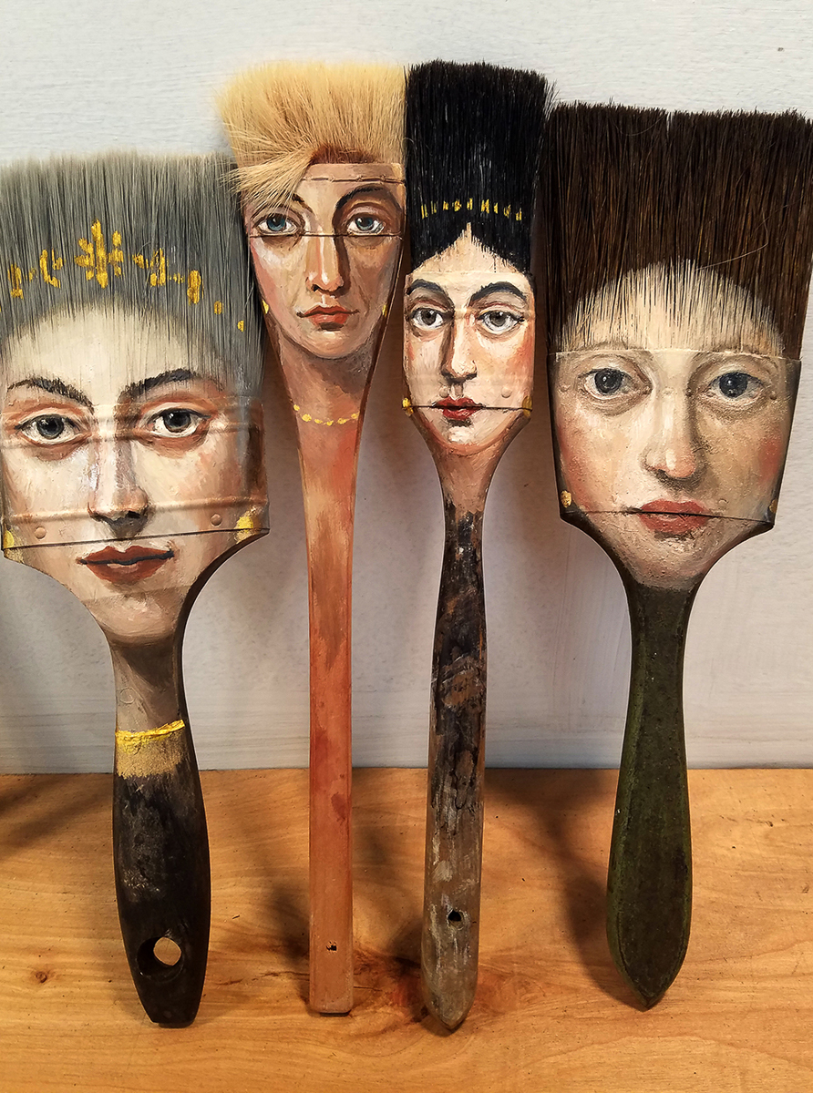 Artist Alexandra Dillon is a Los Angeles-based surrealist who paints on found objects. Her charming portraits on worn paintbrushes have become her signature pieces. Rather than start with a fixed idea for her imaginary people, she just begins to paint. “They just show up and tell me who they are” she says. Working on each piece over the course of several days, she finds the emotion and personality of her characters. The results are beautiful and engaging faces, often reminiscent of Roman-Egyptian mummy portraits or Baroque painting. “I’m influenced by the art of every era”, she says.