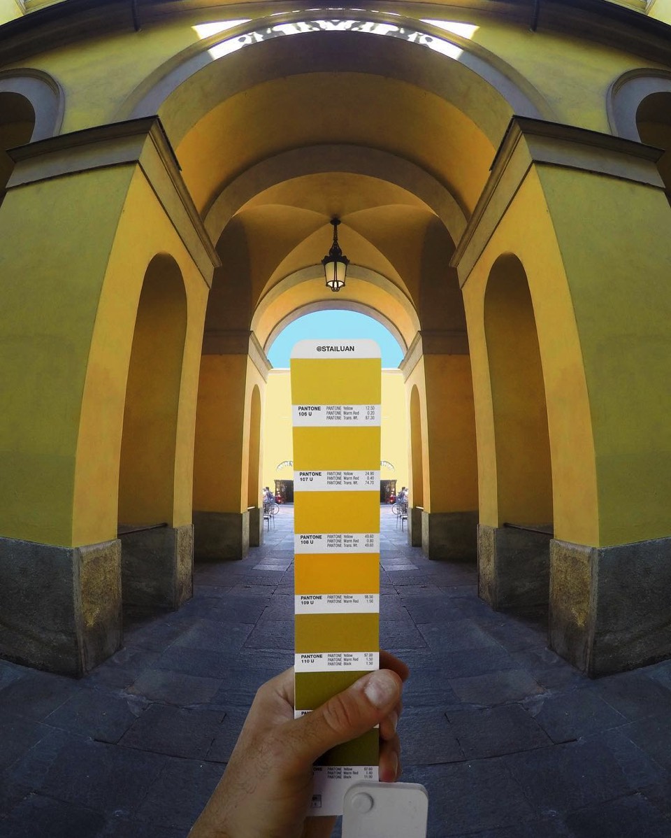 Using the Pantone system as his guide, Antoni captures stunning photos of the Italian countryside and urban areas. Each image is carefully matched to a selection of Pantone swatches, creating a playful and surreal effect. The colors in the swatches are always present in the original photo, but Antoni's deliberate choice and omission of certain swatches adds contrast and emphasis to each composition, guiding the viewer's gaze.
