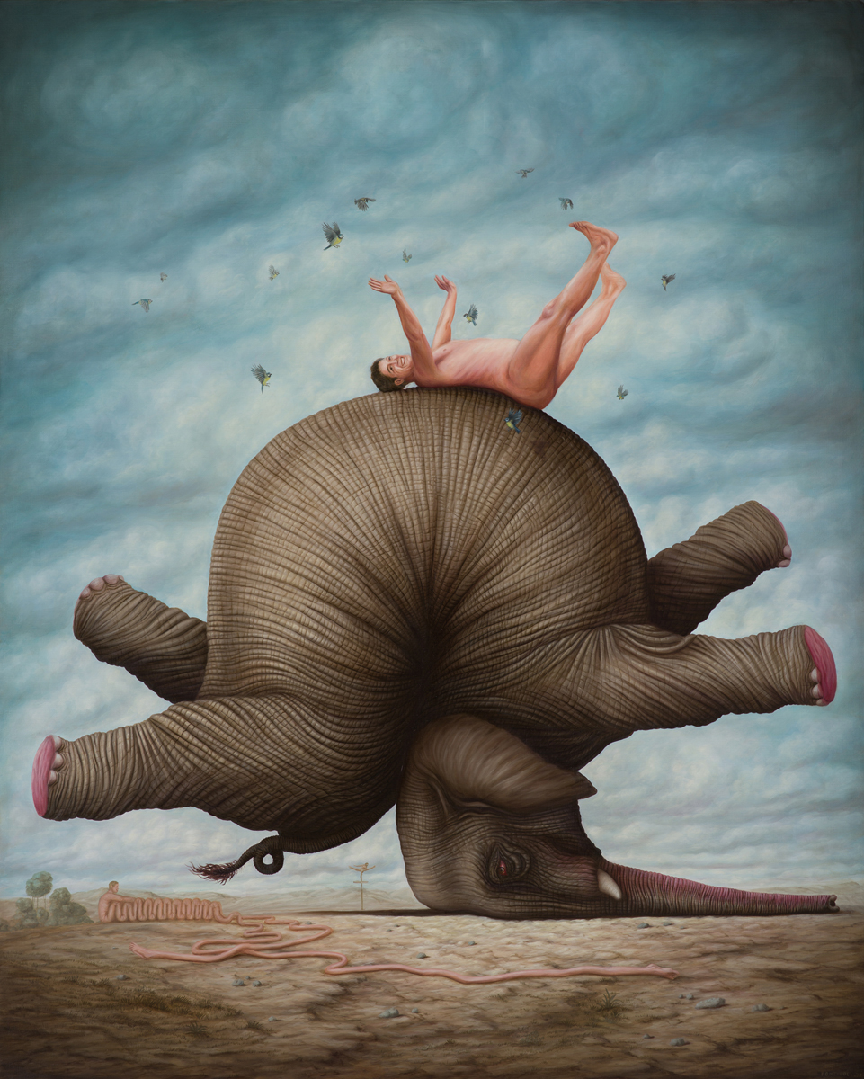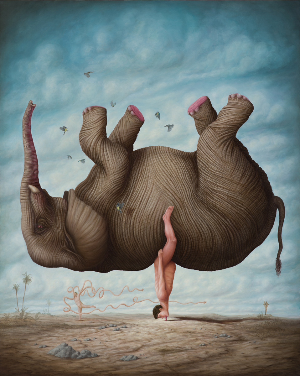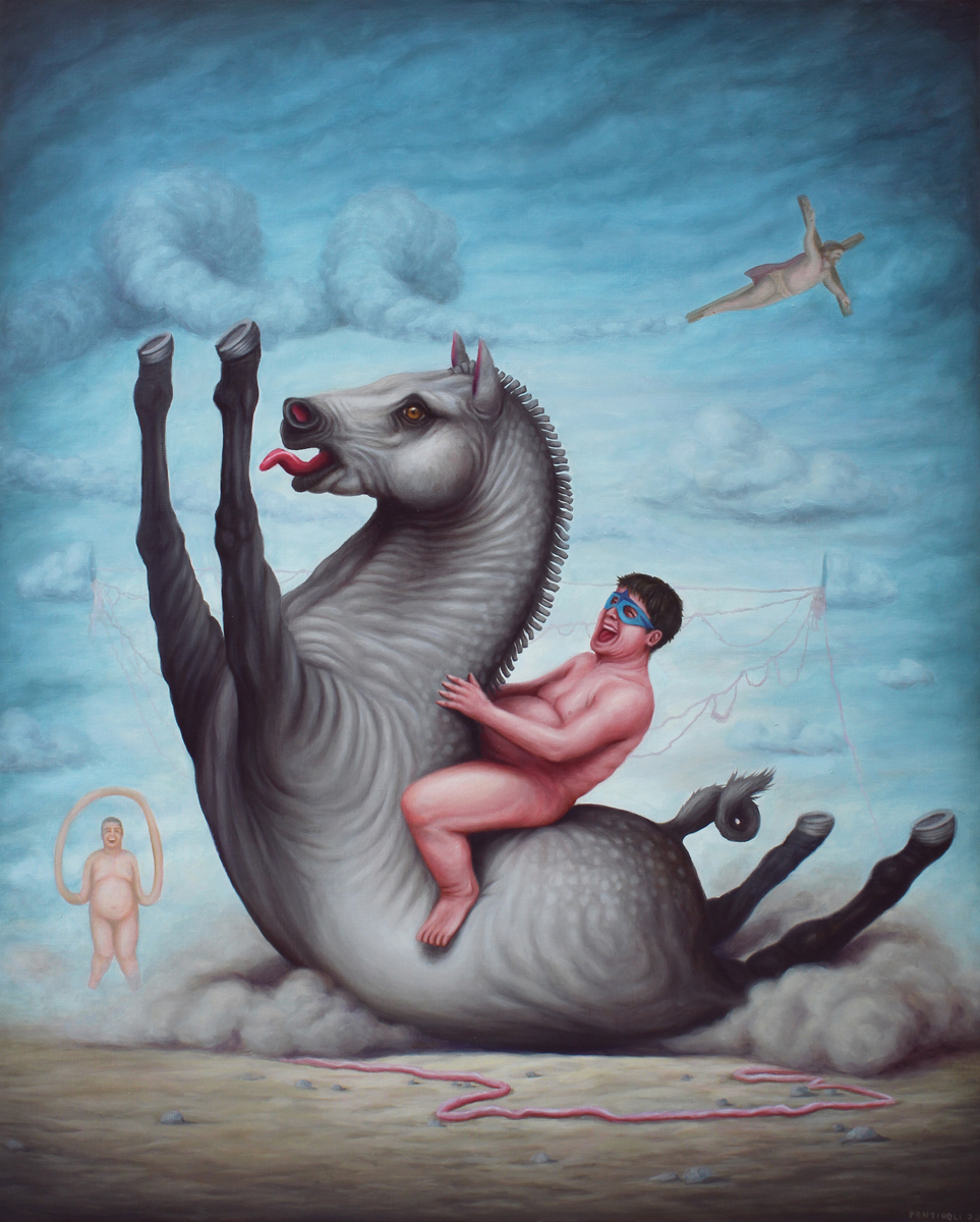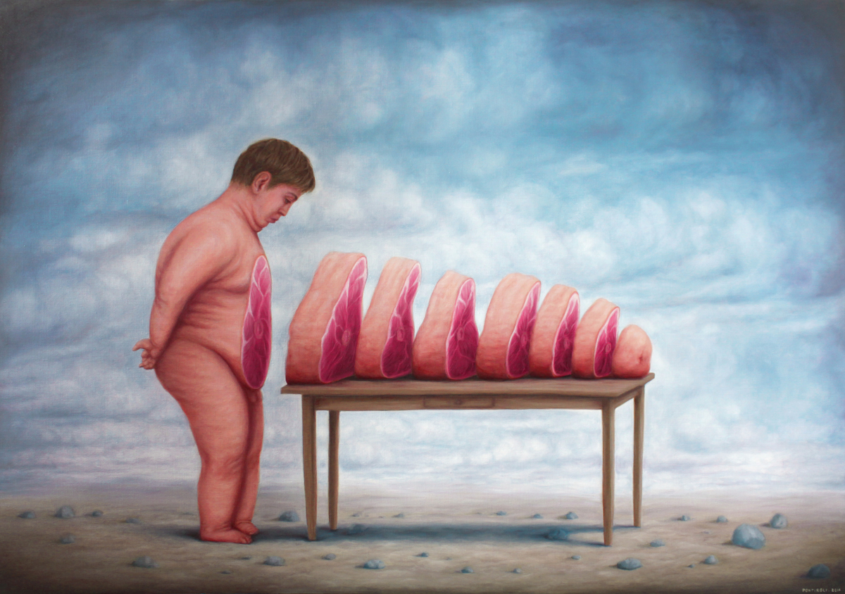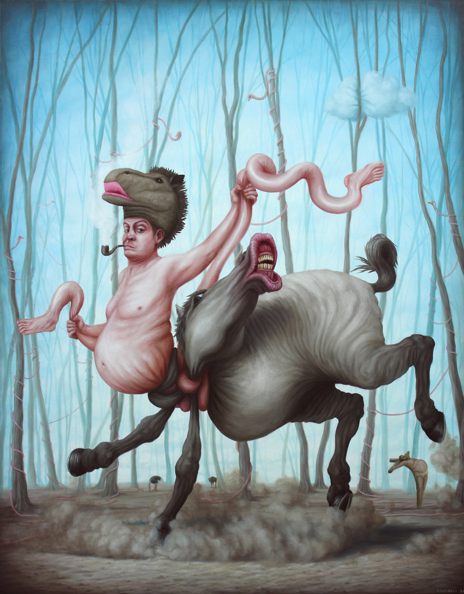 Bruno Pontiroli is a french pop surrealist artist based in Paris. His work aims at turning the narrow vision that we have of the world upside down. Bruno questions the identity of things and tries to reinvent it using representations or crafted settings based on a different logic. He thereby creates in his paintings a universe comprised of the absurd and paradoxes and often described as poetic or dreamlike and that definitely disturbs imagination.
