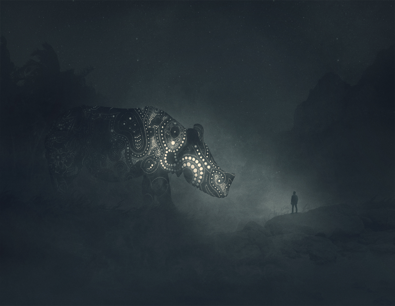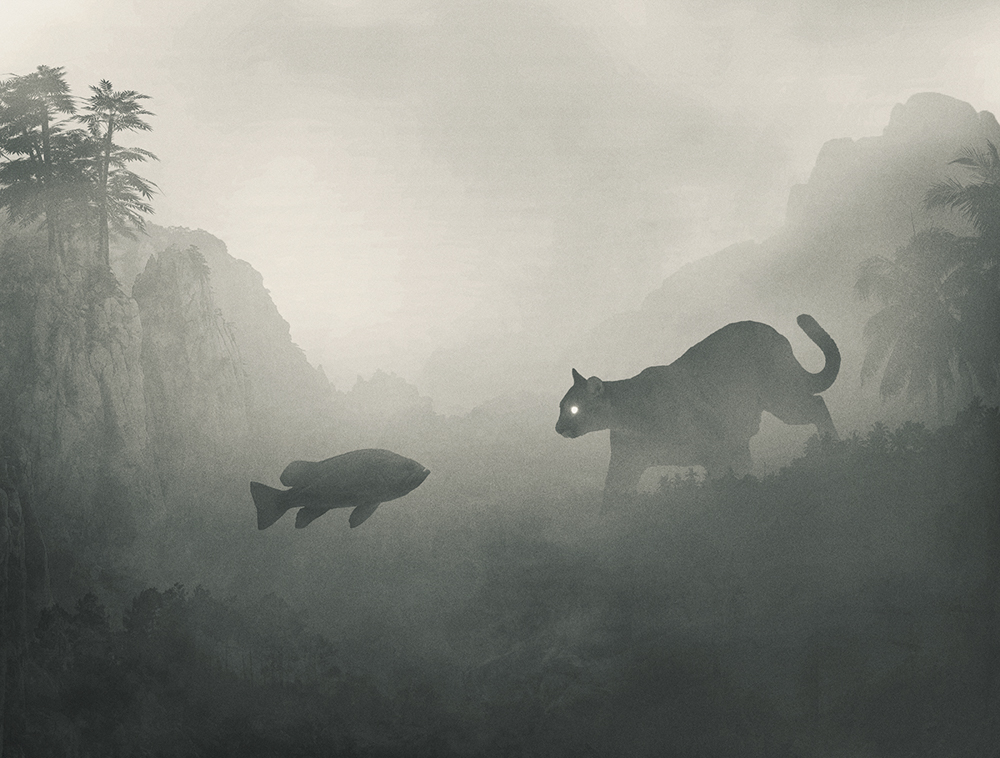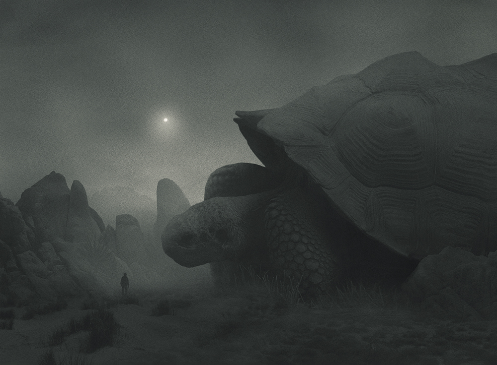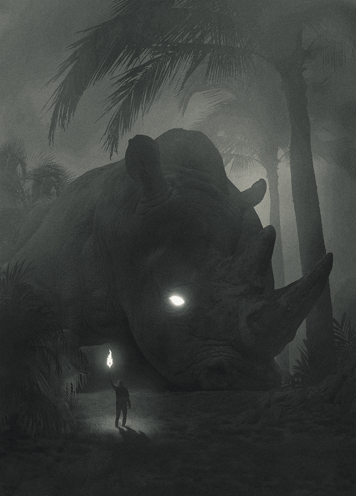 He tried to stop thinking about depression as a weakness and turn it into something brilliant. He started creating dark, mysterious and frightening images originating deep inside his mind. The recurring motif in his work is a small human figure lost in a dark jungle, facing huge creatures. Working on them and contemplating the final effect helped him grow his awareness of who he is and what he’s afraid of. It helped him see his emotions and confront them. It helped him get out of the jungle.