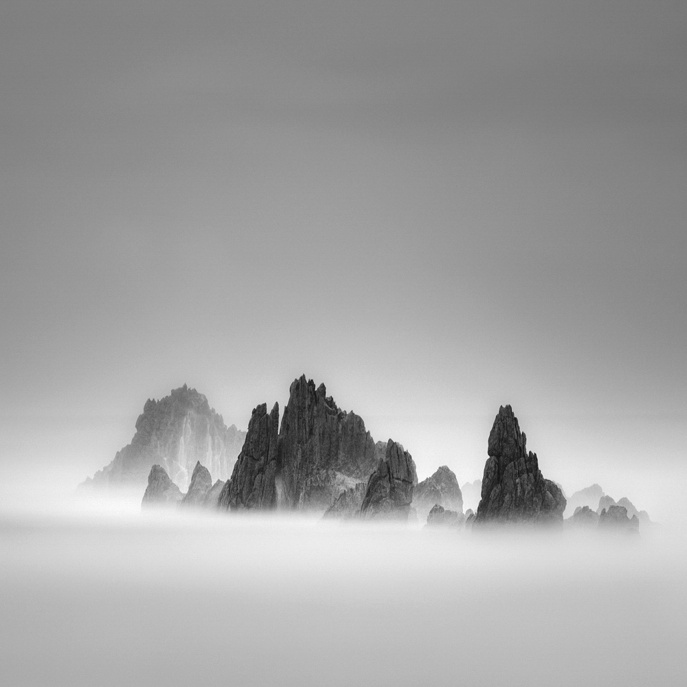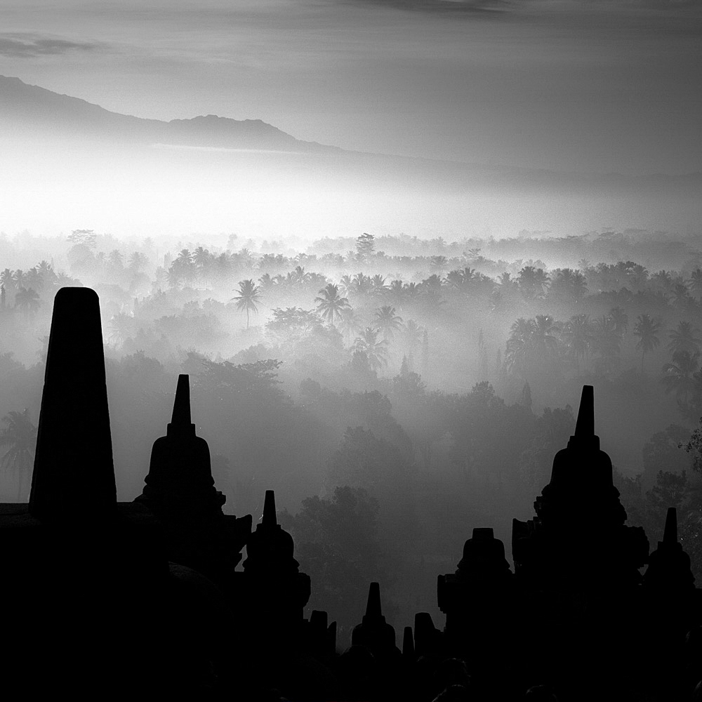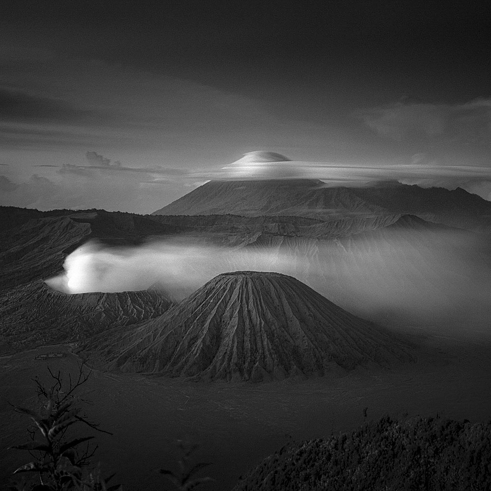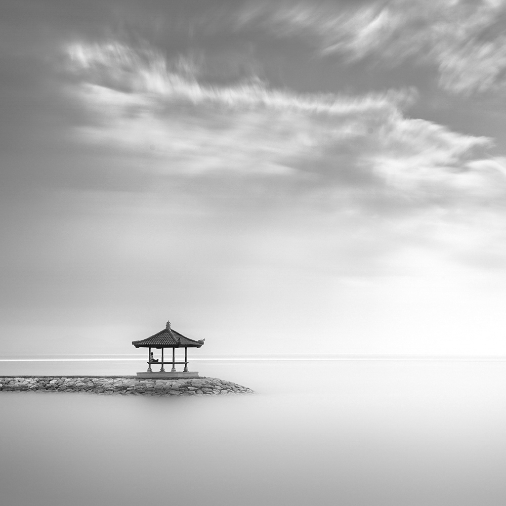 Hengki Koentjoro’s fine art photography goes far beyond the perfect light and shadow drawings of black and white. A native Indonesian, he summits the peaks of the mountains of Java, where the air grows thin. The images he returns with are wide expanses and atmospheric, dense moments. Koentjoro is essentially both an ardent observer and fascinating sculptor of nature. He learned his craft at the Brooks Institute for Photography in Santa Barbara, California. For him, to see and feel nature is both freeing and inspirational. In order to translate a landscape directly into black and white, he lets his imagination run wild, slipping into surprising artistic roles. Thus he looks as if through the eyes of a Buddhist monk across the rainforests of Java from the temple site of Borobudur. Or composes a landscape drama of clouds and mountaintops, in which the spacious depths seems to be skillfully set in relation to concretely represented forms and proximities. The perspectives he employs in his images overwhelm time and again. Clouds and mountain-crests appear so high yet so near, as if the sky plays by different rules in Indonesia. Koentjoro lists Michael Kenna as his greatest role model; like Kenna, he has a fine sense for monochromatic tones and fosters a subject-oriented minimalism. His style thus appears astoundingly certain and rich in form. Shot in a dense, lively atmosphere and exaggerated through a narrative or visual drama, Koentjoro transforms fleeting snapshots of nature into lengthy moments of timeless, natural beauty.