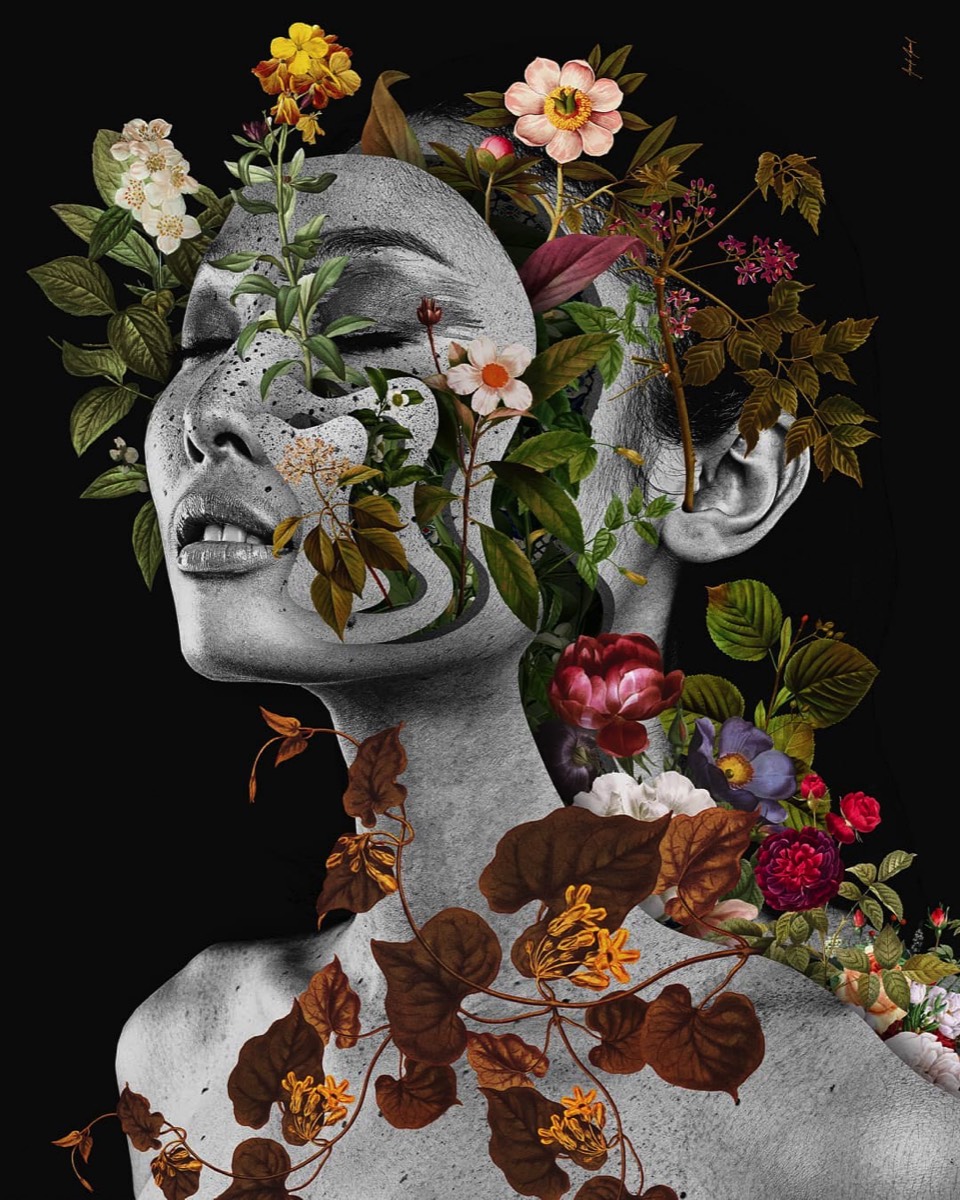 In your collages you mostly use natural elements such as flowers. You create an atmosphere of unusual beauty by adding these beautiful elements to your main subjects. Why flowers?