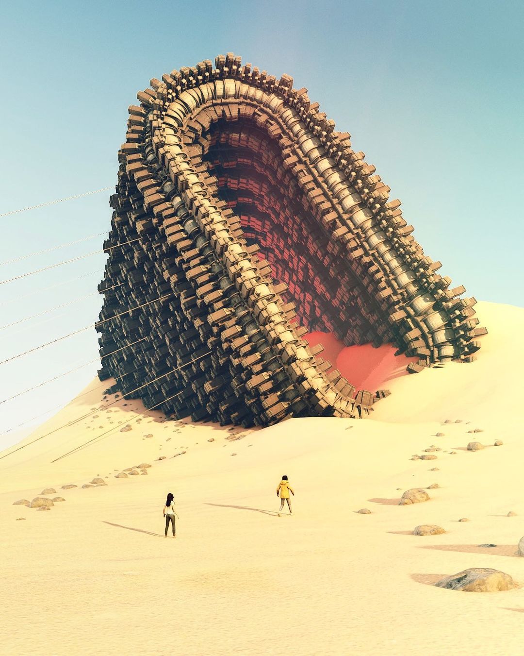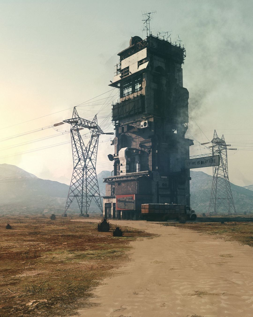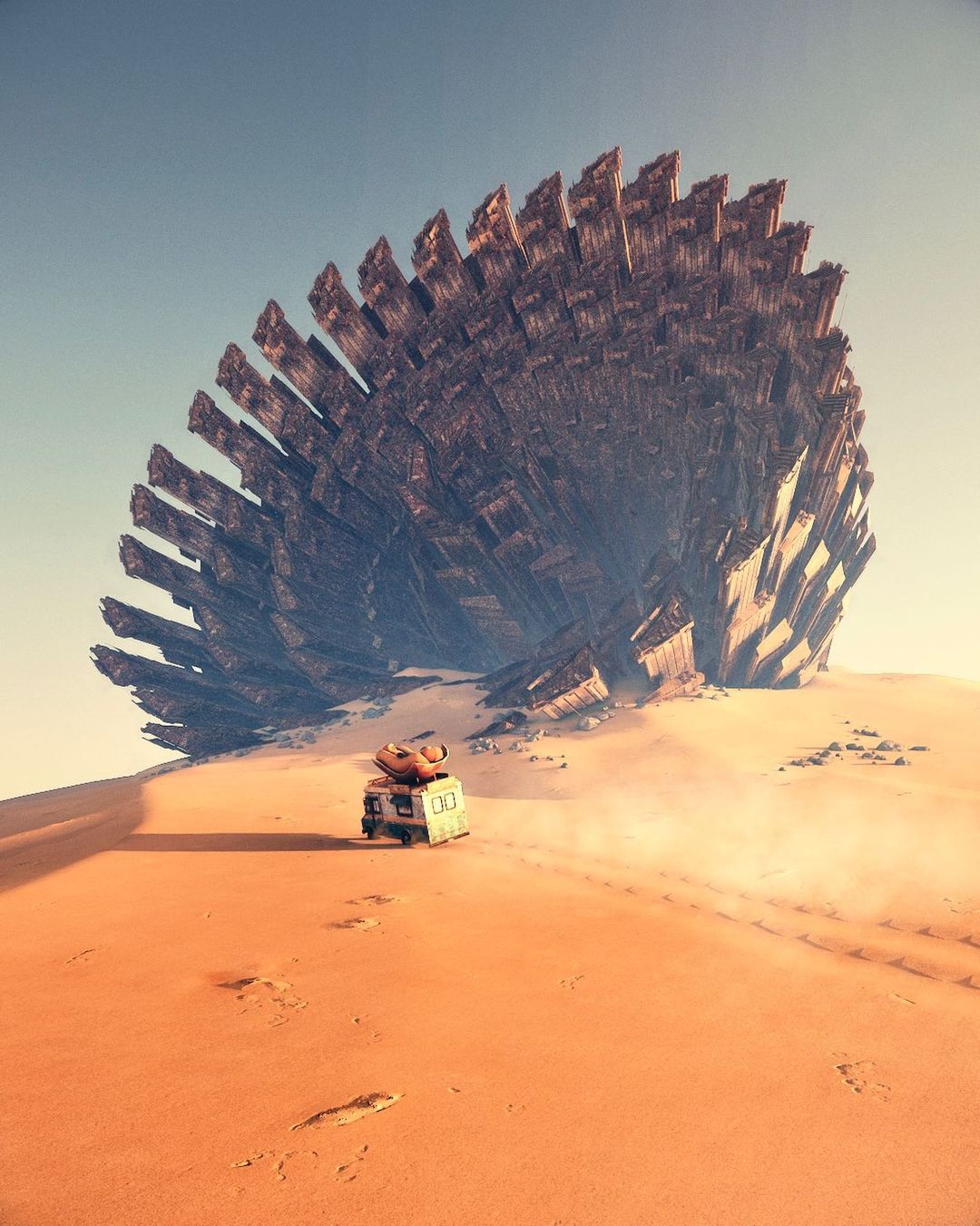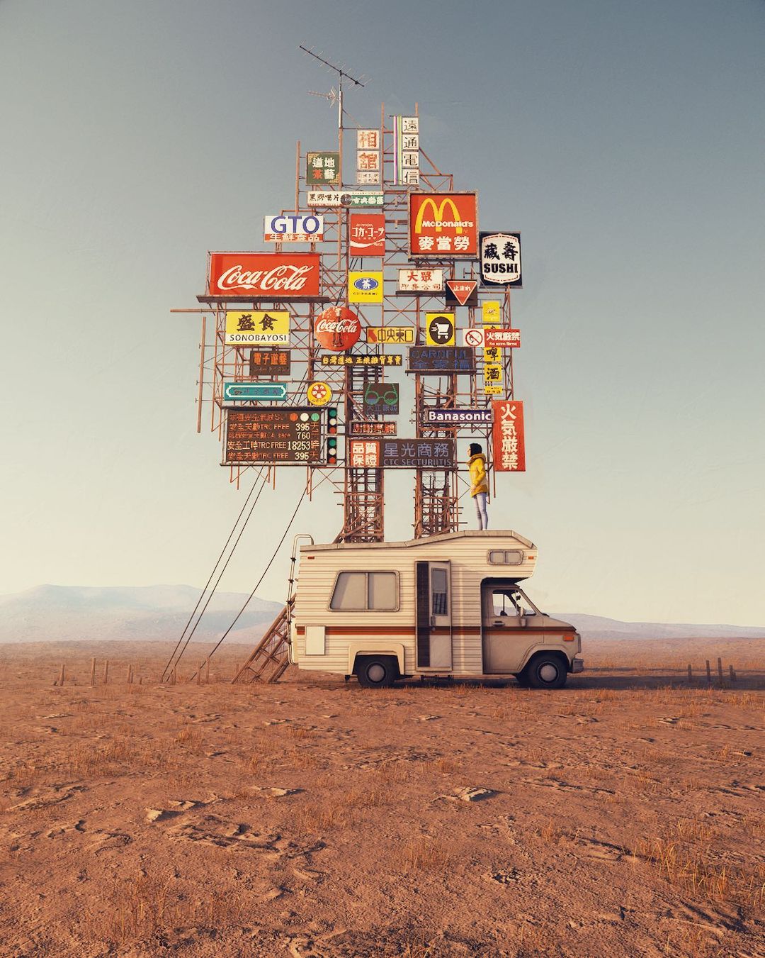Ruben Kos, alias rbnks is a Digital Artist living in Utrecht, the Netherlands. The settings of his artworks describe, with a humorous touch, a mostly desolate post-apocalyptic world where ancient objects still survive. In this new era, these recognizable symbols and pop culture characters are the only remaining links to the past.