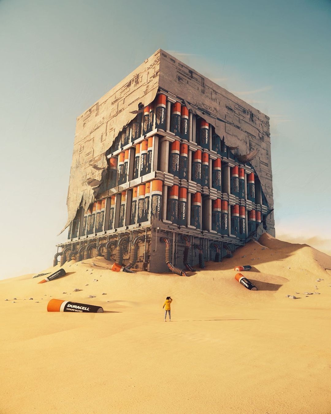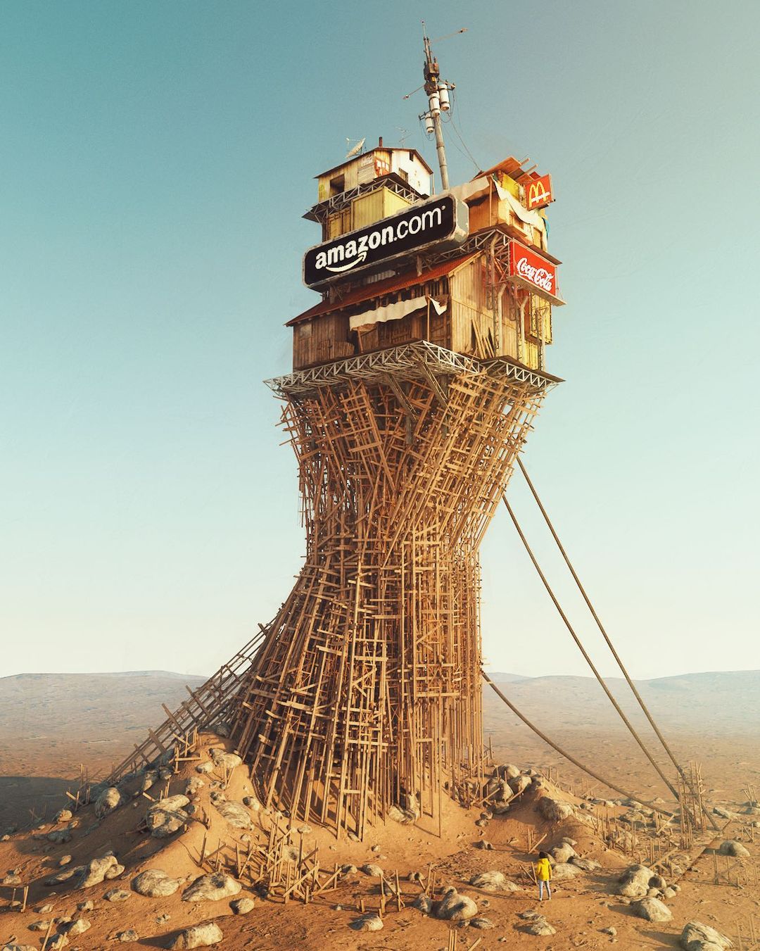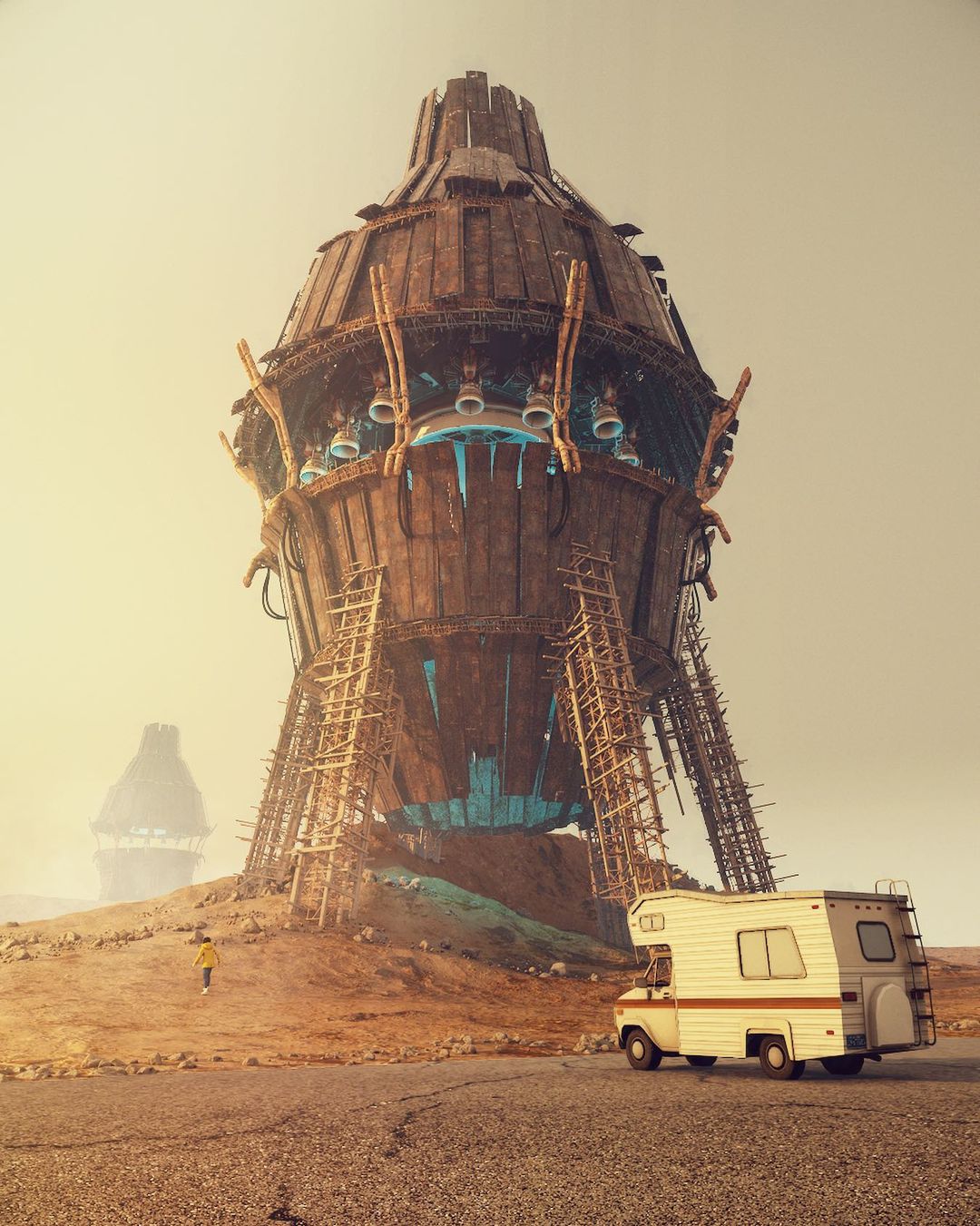 Ruben’s blend of sci-fi imagery with everyday landscapes makes his work stand out. Using his signature method of stacking buildings and objects on top of each other to make viewers contemplate the history of these creations. Ruben’s unique approach of combining unfamiliar structures with well-known characters and commercial signs in desolate landscapes makes his art unique.