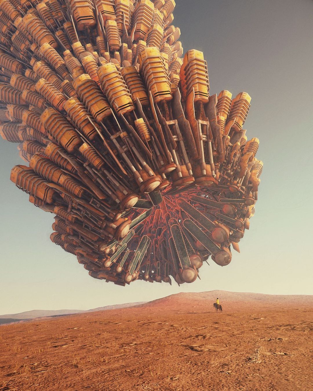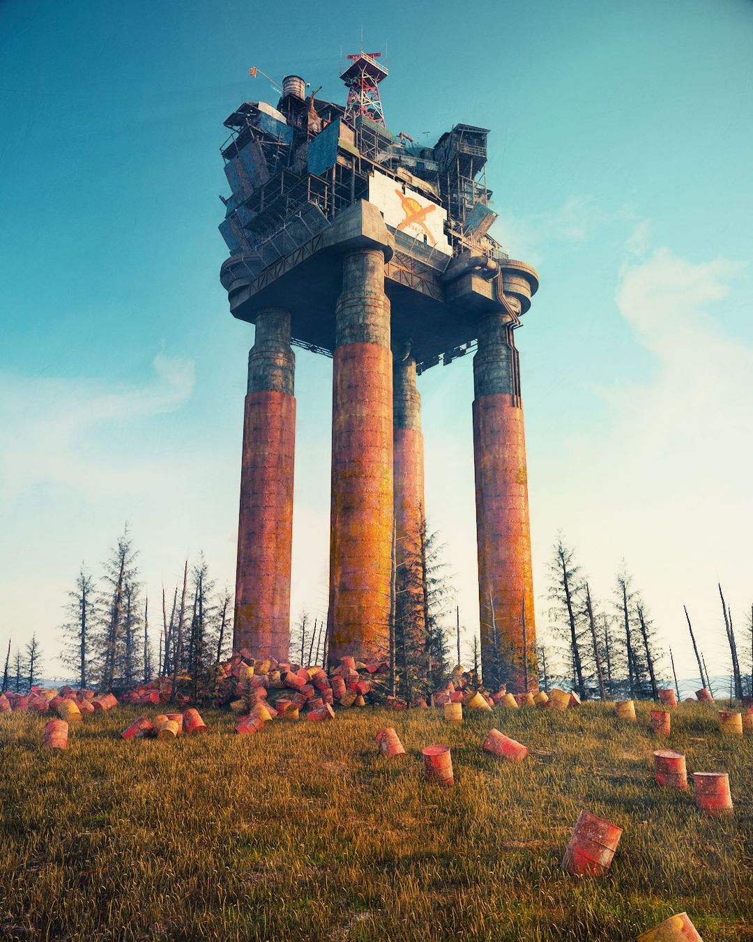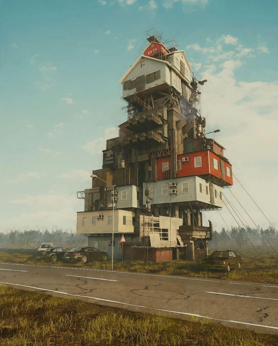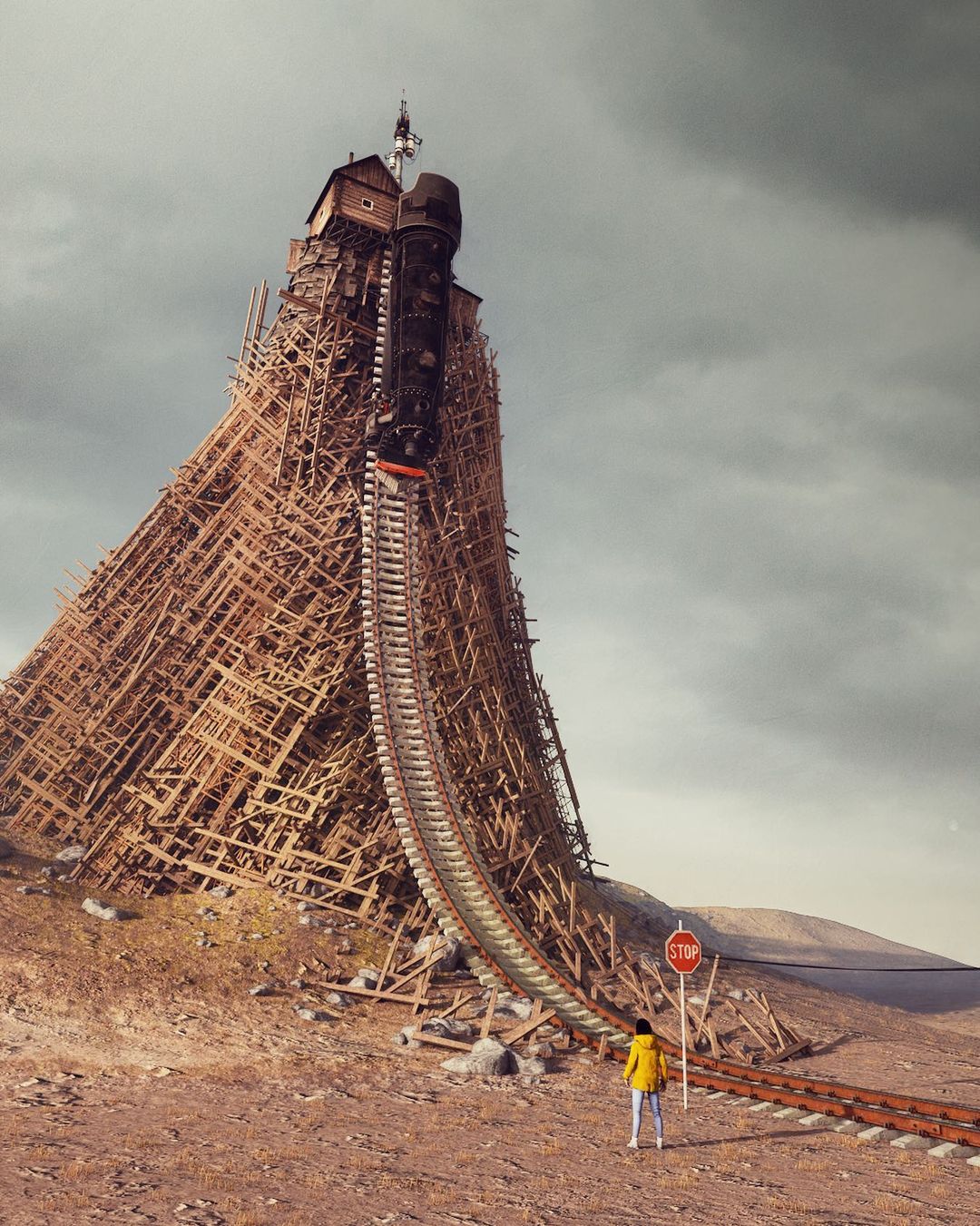Ruben’s blend of sci-fi imagery with everyday landscapes makes his work stand out. Using his signature method of stacking buildings and objects on top of each other to make viewers contemplate the history of these creations. Ruben’s unique approach of combining unfamiliar structures with well-known characters and commercial signs in desolate landscapes makes his art unique.